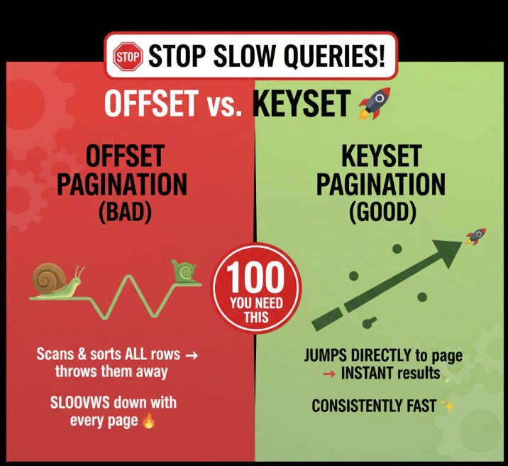 If your app has infinite scroll, deep dashboards, or reports with page 200… and it gets slower the deeper users go, there’s a high chance you’re using PostgreSQL OFFSET/LIMIT pagination.