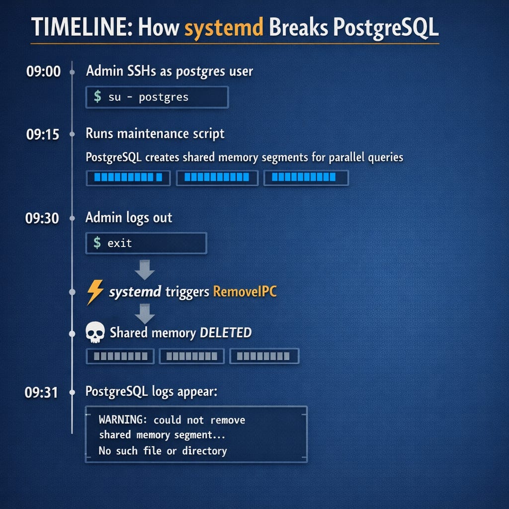 Translation: systemd can delete PostgreSQL’s shared memory segments while the database is still running.