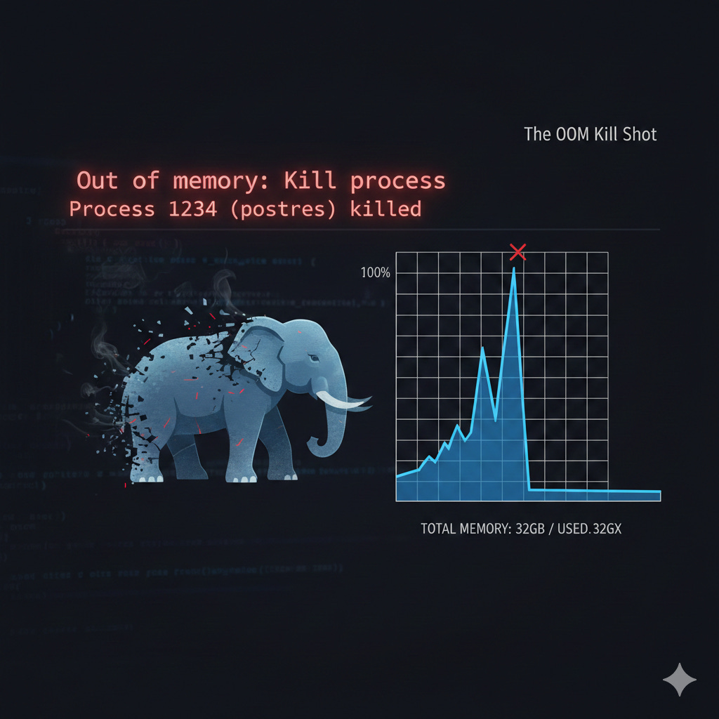 Out of memory: Kill process 12345 (postgres) score 950The Linux kernel terminated your database because PostgreSQL attempted to consume more RAM than available. This triggers crash recovery, causing 30 seconds to 20+ minutes of complete unavailability depending on WAL volume.